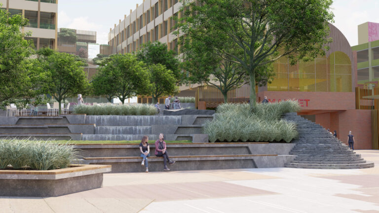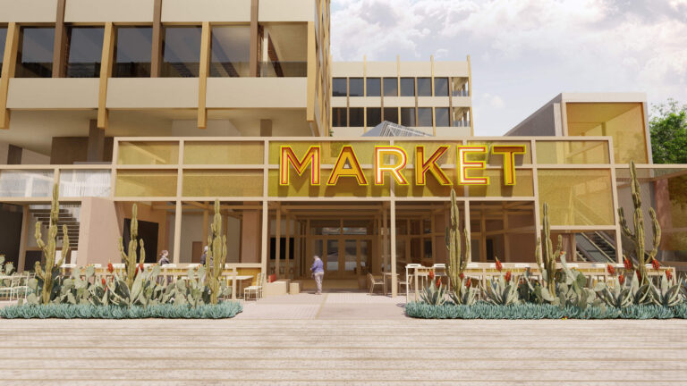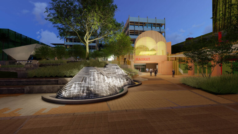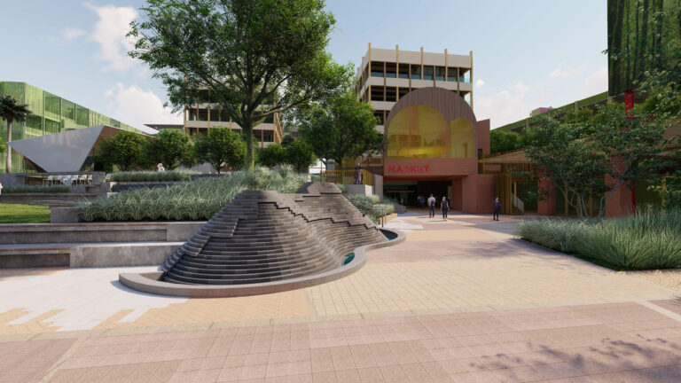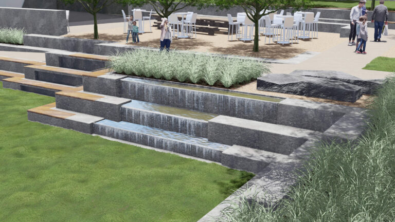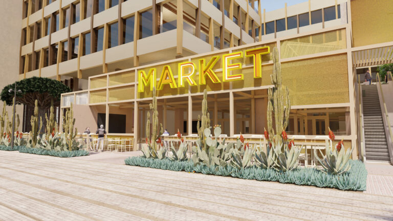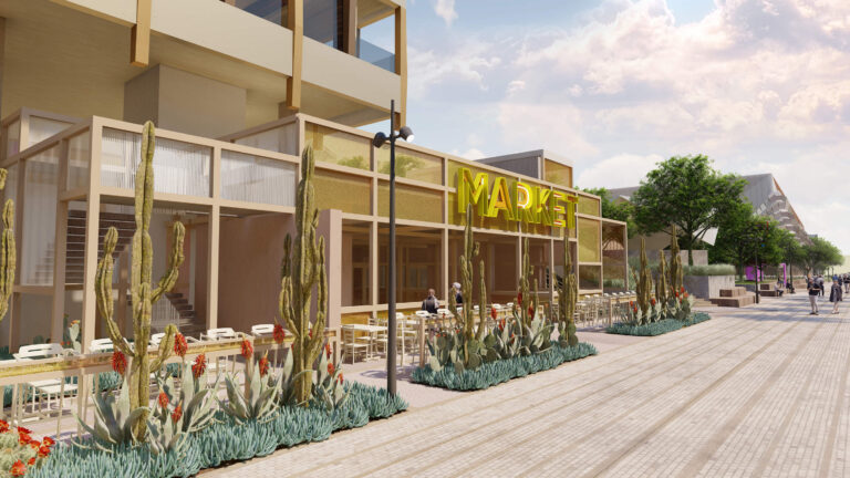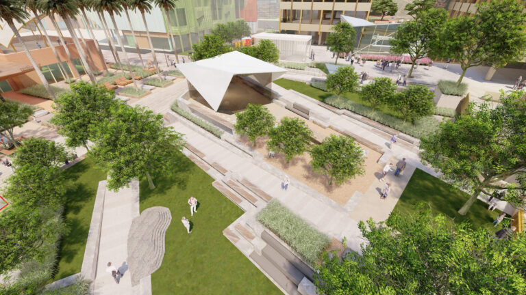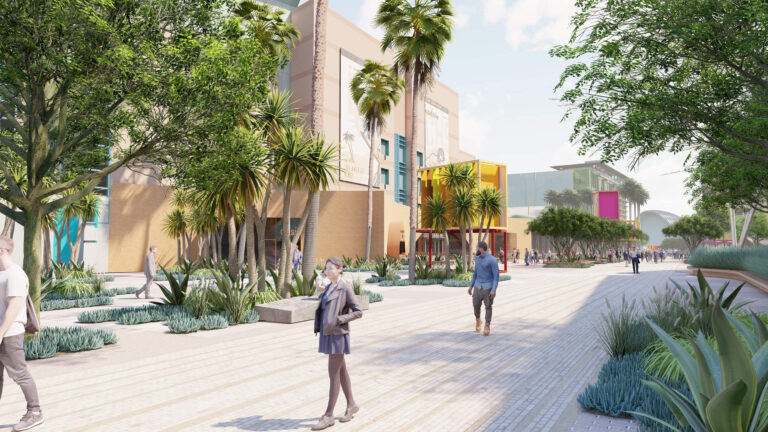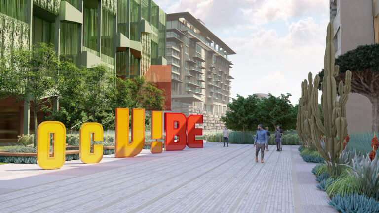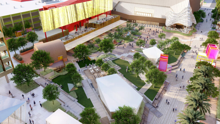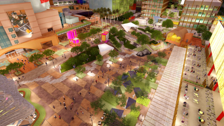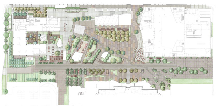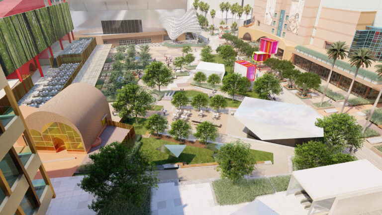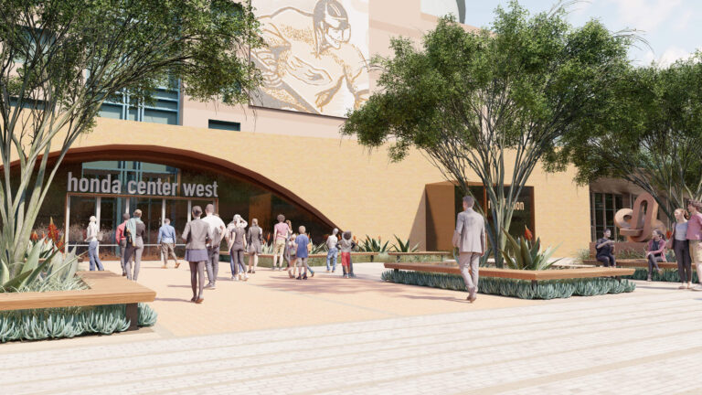 OCVIBE is a planned entertainment district centered on the existing Honda Center in Anaheim, California. Burton Studio evolved the project’s master plan into a specific design for the urban park, paseo, public and private streets, and parking buildings. The development will include retail and dining additions to the Honda Center, a new concert hall, and a market hall building, all of which open onto the central urban park. The space, imagined as a sequence of natural environments, evokes various southern California landscapes. ‘Montane Uplands’ at the highest point of the market hall cascade to ‘Oak Foothills,’ with additional references to desert and agricultural settings. The result is a landmark civic space for Anaheim that can accommodate daily use on an intimate scale as well as major events for thousands of attendees.